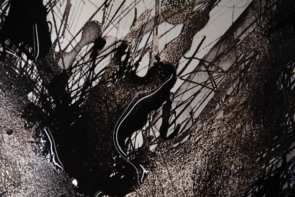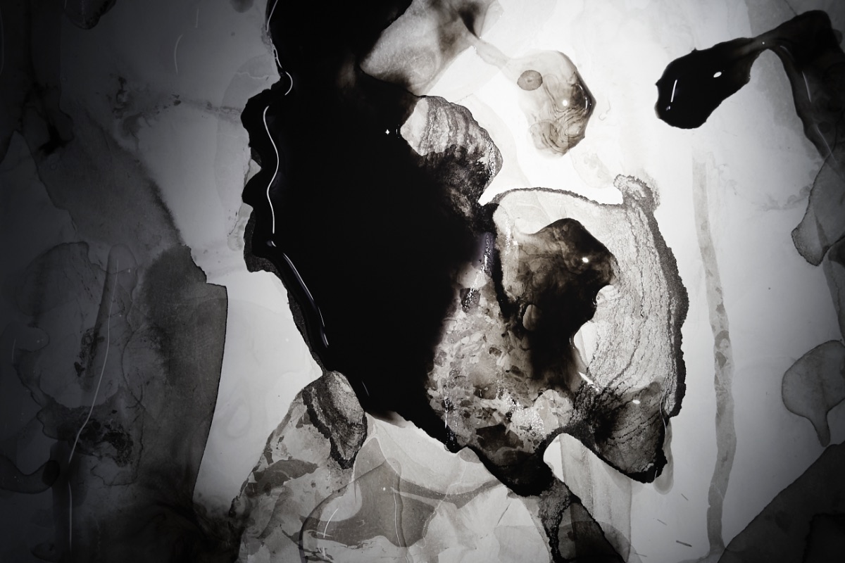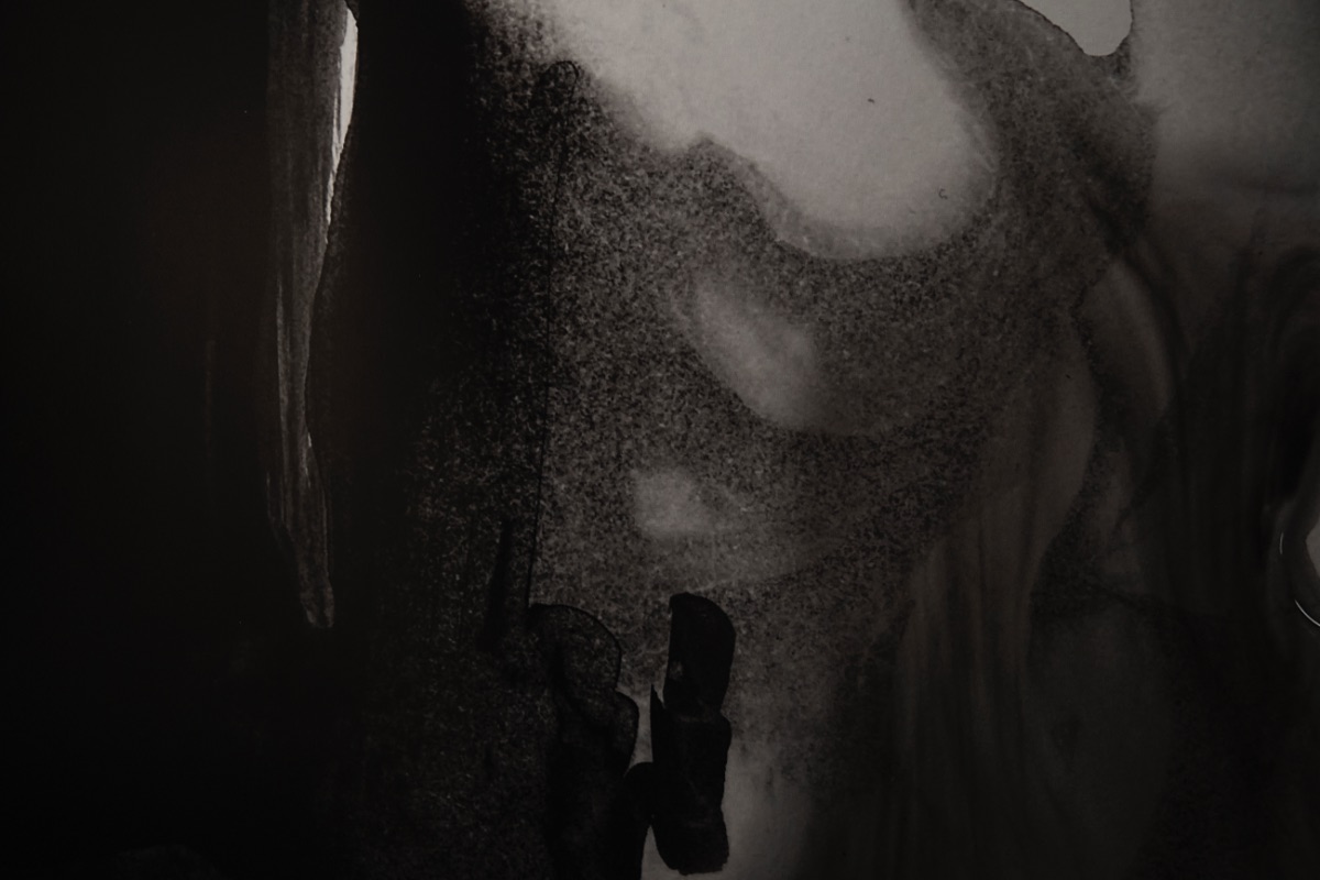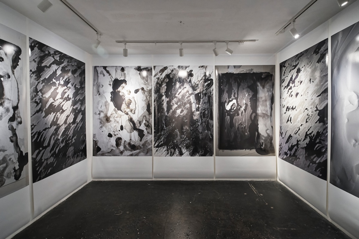今作の浩伺さんの絵は、⻑い時間を掛けて緻密に描かれる普段のシリーズとは対象的に、ものの数分で次々と描かれていきます。筆と墨汁によって描き終えられた直後のその絵は、ちょっとでも動かすと絵全体が流れ動いてしまうほど、紙に吸収されるもしくは蒸発待ちの⽔分たちがまだゆるゆると表⾯張⼒している状態。「この瞬間を表現できないかと、家で描いている時よく思っていた」と聞いていた僕は、なるほどこういう事かと思いながら、卓上の新鮮なそれをカメラと⼀緒に眺めていました。