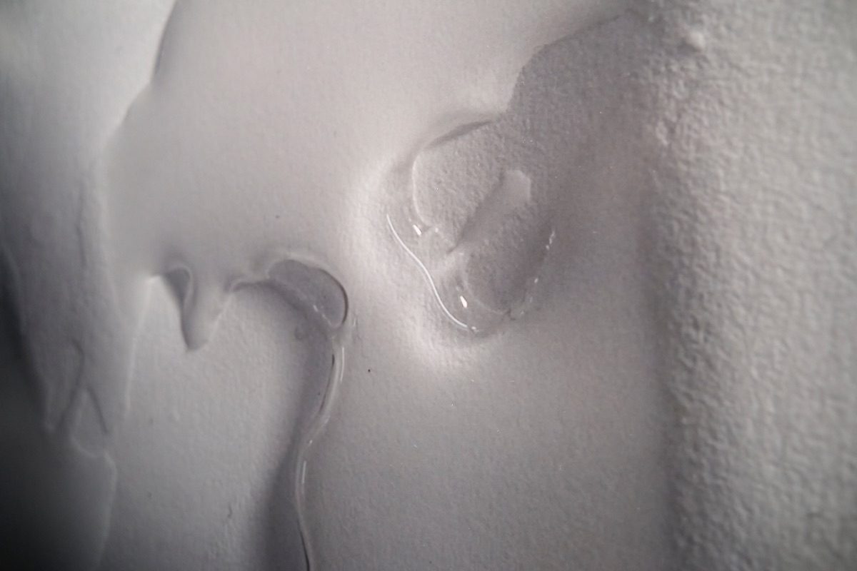 水を吸ってふやけた紙、水を弾いている部分、何も塗られていない紙の表面。